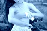A teenager applies insect spray on his hand. The concept of prevention from mosquito bite.
