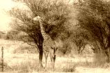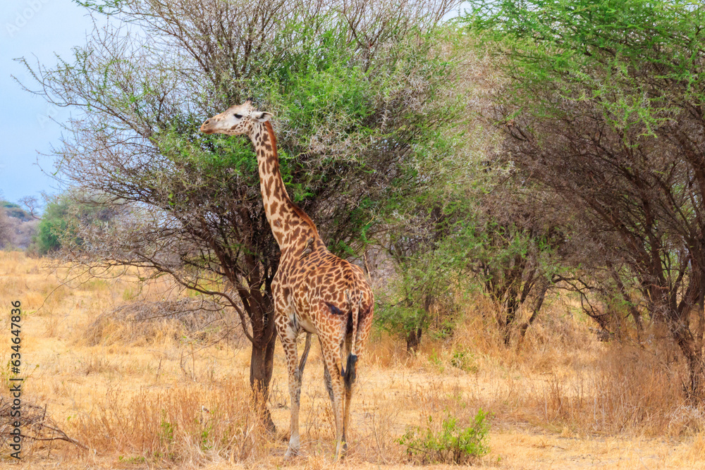 Giraffe in savanna in Tarangire national park in Tanzania. Wild nature of Tanzania, East Africa