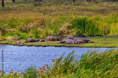 Group of hippos (Hippopotamus amphibius) laying on a lakeshore in Ngorongoro Crater national park, Tanzania