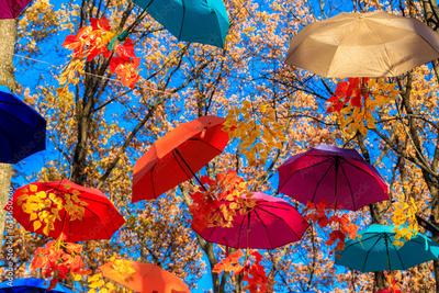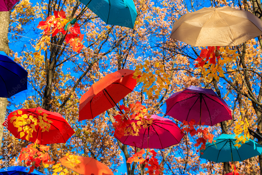 Multicolored umbrellas on the autumn park. Colorful umbrellas hanging among trees in the fall