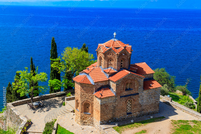 View of Church of St. John at Kaneo and Lake Ohrid in the city of Ohrid, North Macedonia