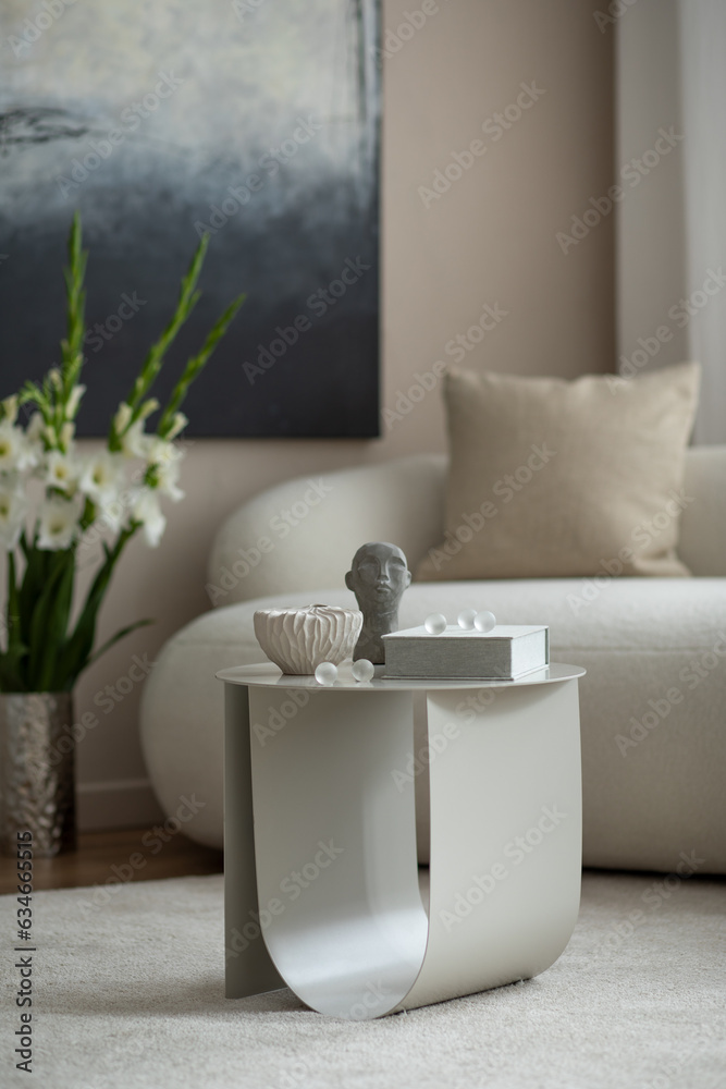 Aesthetic composition of elegant living room interior with mock up poster frame, boucle sofa, marble arch console, stylish mirror, vase with flowers and personal accessories. Home decor. Template.