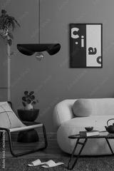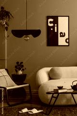 Cozy composition of living room interior with mock up poster frame, white sofa, black lamp, stylish armchair, glass coffee table, pillow, gray carpet and personal accessories. Home decor. Template.