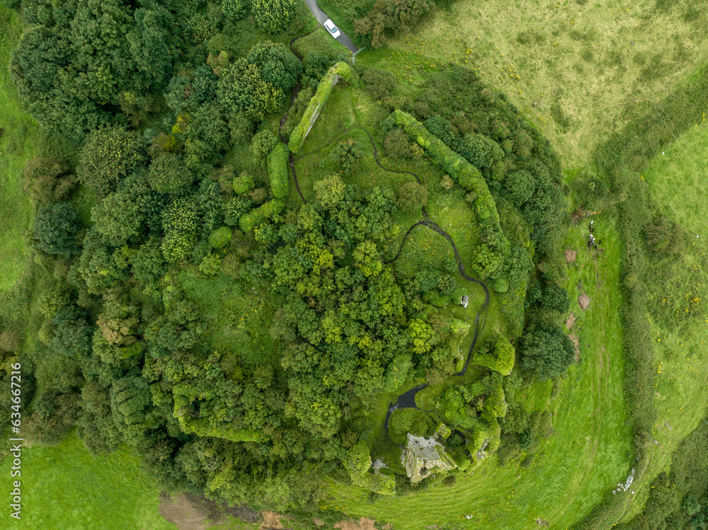 Aerial view of Carrigogunnell Castle superbly situated on a volcanic rock with a marvellous view overlooking the whole Shannon estuary near Clarina in County Limerick Ireland