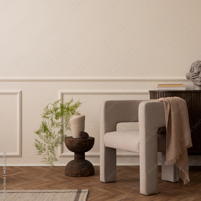 Creative composition of living room interior with wooden sideboard, stylish armchair, vase with green leaves, wall with stucco, plaid, sculpture, lamp and personal accessories. Home decor. Template.