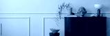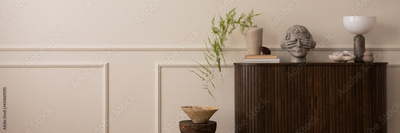 Elegant composition of living room interior with copy space, wooden sideboard, gray sculpture, vase with green leaves, wooden stand, bowl, marble lamp and personal accessories. Home decor. Template.