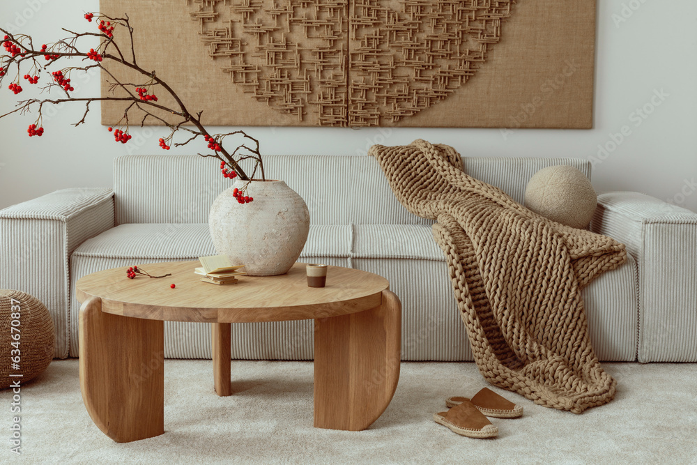 Warm and cozy living room interior with mock up poster frame, modular beige sofa with pillows, round coffee table, vase with rowan, rug, slippers and personal accessories. Home decor. Template.