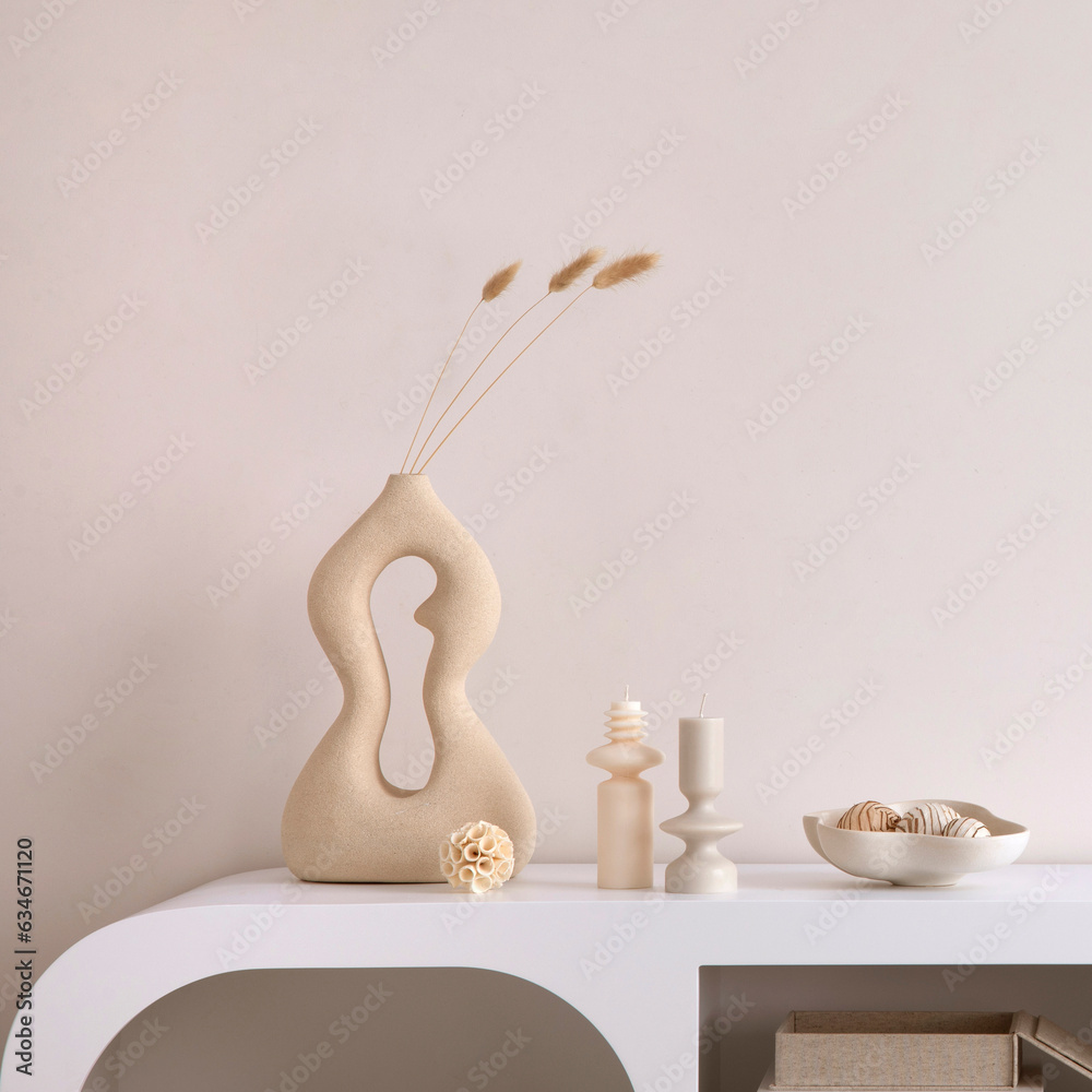 Interior design of harmonized living room with mock up poster frame, white commode, vase with leafs, decoration and personal accessories. Cozy home decor. Template.