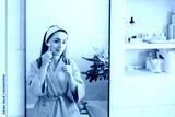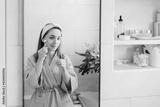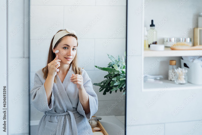 Young woman in bathrobe looking in mirror and making face massage with jade roller in the bathroom. The concept of natural procedures for skin care. Home Beauty self-care treatment. Selective focus