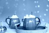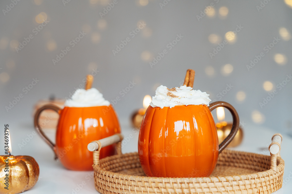 Pumpkin shaped cups of hot drink with whipped cream and cinnamon stick on white table with fall decor. Pumpkin latte with spices. Cozy autumn beverage for Thanksgiving or Halloween holidays at home