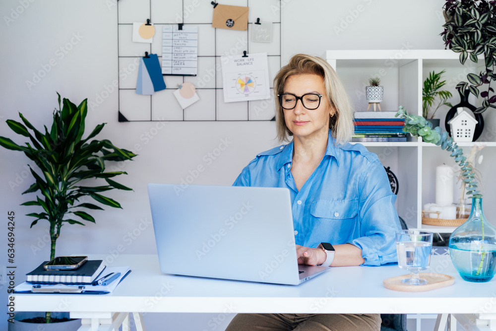 Portrait of 50's confident mature businesswoman, middle-aged experienced senior female professional working on laptop in cozy office work place. Female CEO, creative entrepreneur manage business.