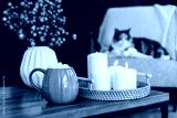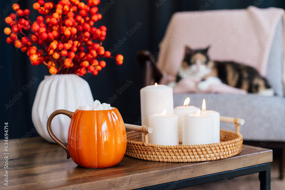 Closeup pumpkin shaped cup of hot drink with marshmallows, flower vase, burning candles on coffee table with blurred relaxed cat on the armchair. Autumn, fall cozy mood composition of hygge home mood.
