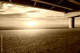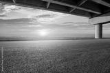 Asphalt road and city skyline with bridge architecture at sunset