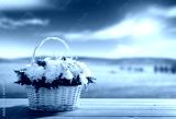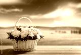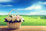 flowers on table and spring field
