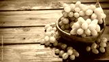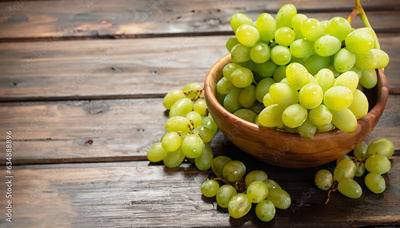 Bunch of green ripe grapes in a wooden bowl, on rustic wood background