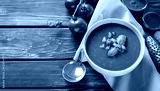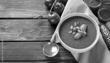Tasty appetizing summer tomato soup puree gazpacho with tomatoes and cucumbers served in bowl on wooden background.