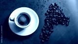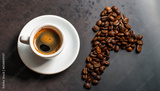 Fresh tasty espresso cup of hot coffee with coffee beans on dark background