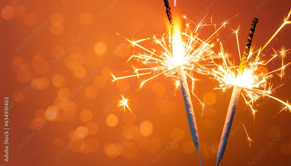 two burning sparklers with shiny lights at the edge of modern abstract orange background, graphical miracle candles party concept with copy space for happy new year, christmas and other holidays