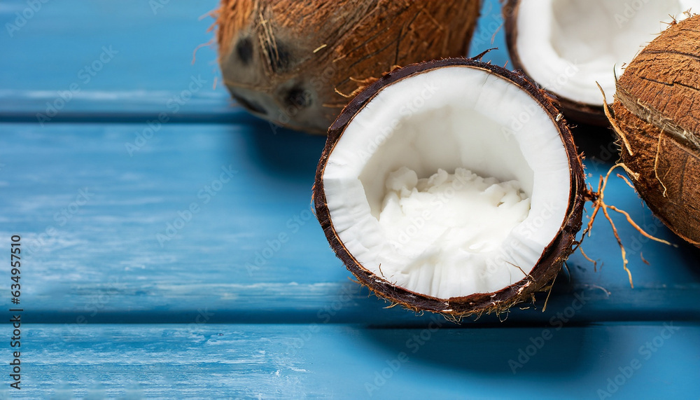 Open coconut with white pulp on blue wooden background. Organic dietary vegan product widely used in cosmetics