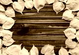 Background group of autumn yellow leaves on a brown wooden background. Frame.