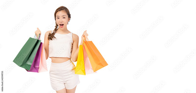 Portrait excited beautiful woman hold shopping bags isolated on white background and copy space Surprise happy asian young lady open mouth with excited Beauty young cheerful female love shopping