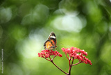Leopard Lacewing butterfly on red flower with green bokeh background
