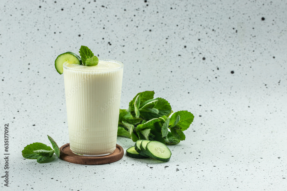 Homemade yogurt drink Ayran with fresh cucumber on a blue background, clean eating for weight loss. place for text