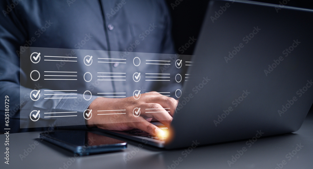 technology, checklist, contract, working, business, management, smartphone, document, approval, inspections. typing at keyboard for check checklist and management document approval inspections.