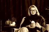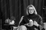 Smiling middle aged woman relaxing with pumpkin shaped cup of hot drink with whipped cream and cinnamon stick with fall mood composition for hygge home decor on background. Cozy autumn holidays