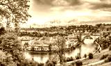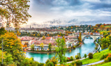 Amazing autumn view of Bern city on Aare river during evening with Pont de Nydegg bridge and Nydeggkirche - Protestant church
