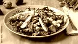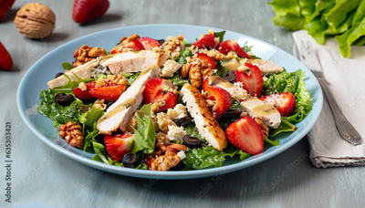 Delicious salad with fried chicken, blue cheese, strawberries and walnuts. Front view.