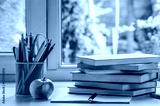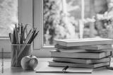 A stack of books, a stand with pencils and pens, and an open notepad against the window. Back to school, teacher's day.