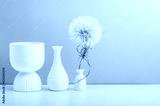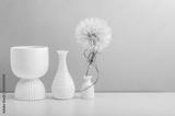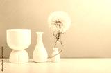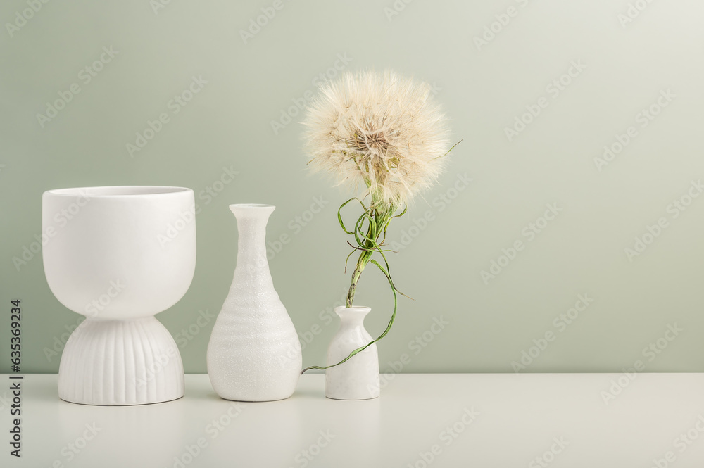 Three ceramic vases and a large dandelion on a white table against an olive wall.