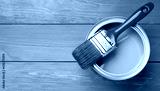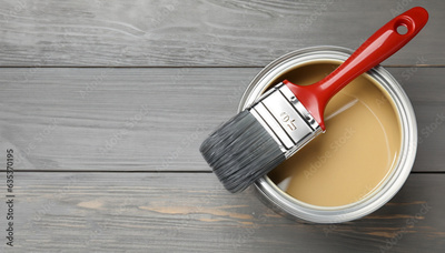 Can of light paint and brush on grey wooden table, flat lay. Space for text