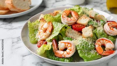 Delicious Caesar salad with shrimps on white marble table, closeup