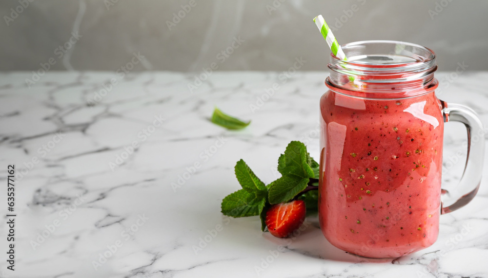 Mason jar of tasty strawberry smoothie with oatmeal and mint on white marble table, space for text