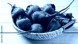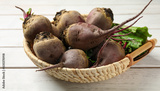 Basket with fresh sugar beets on white wooden table, closeup