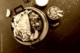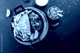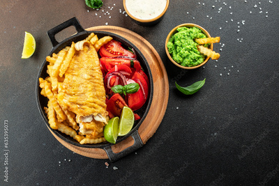 Authentic traditional British cuisine fish and chips served with mashed peas, vegetable salad, tartar sauce. top view