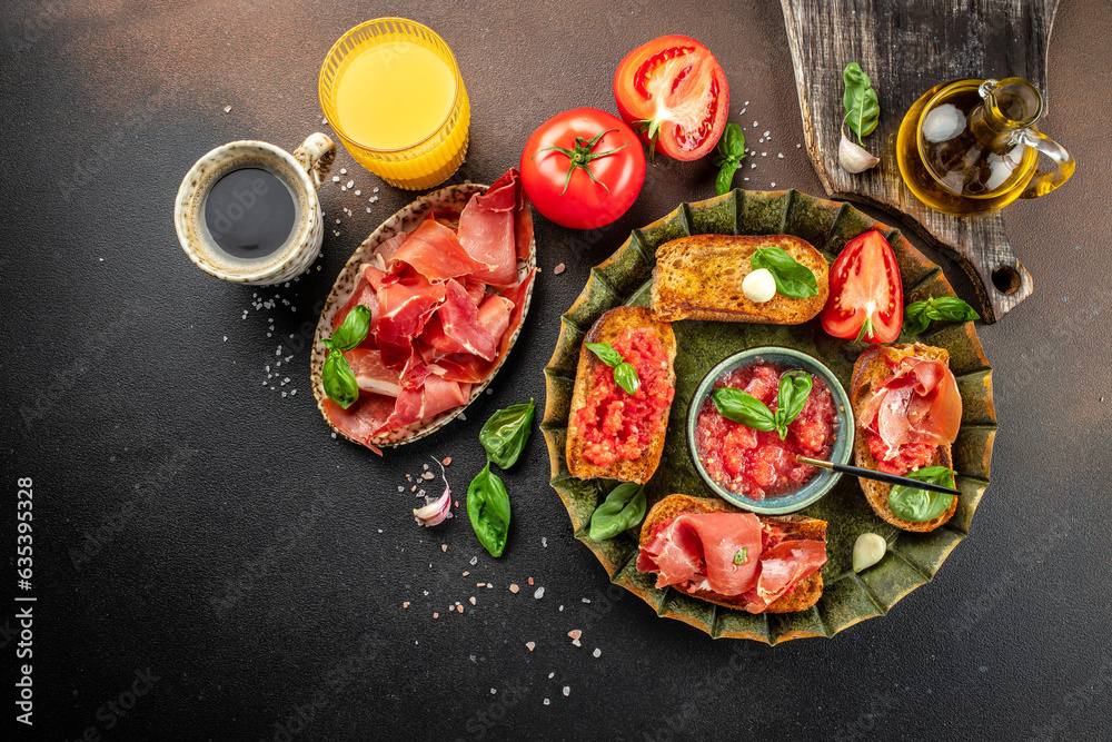 Spanish breakfast. Tostada with ripe tomato and ham jamon with coffee and juice