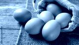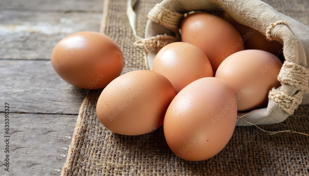 Fresh eggs are placed on a wooden table and fresh eggs are placed in an organic farm sack bag.