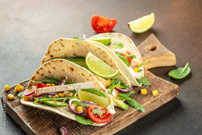 Tacos with grilled chicken, avocado, fresh tomatoes, limes. mexican burritos on a wooden board. banner, menu, recipe place for text, top view