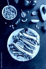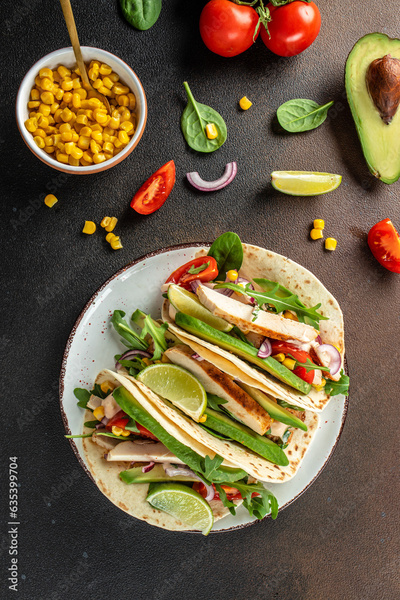 Burritos wraps with chicken, avocado, fresh tomatoes, limes on plate. Mexican dish. place for text, top view