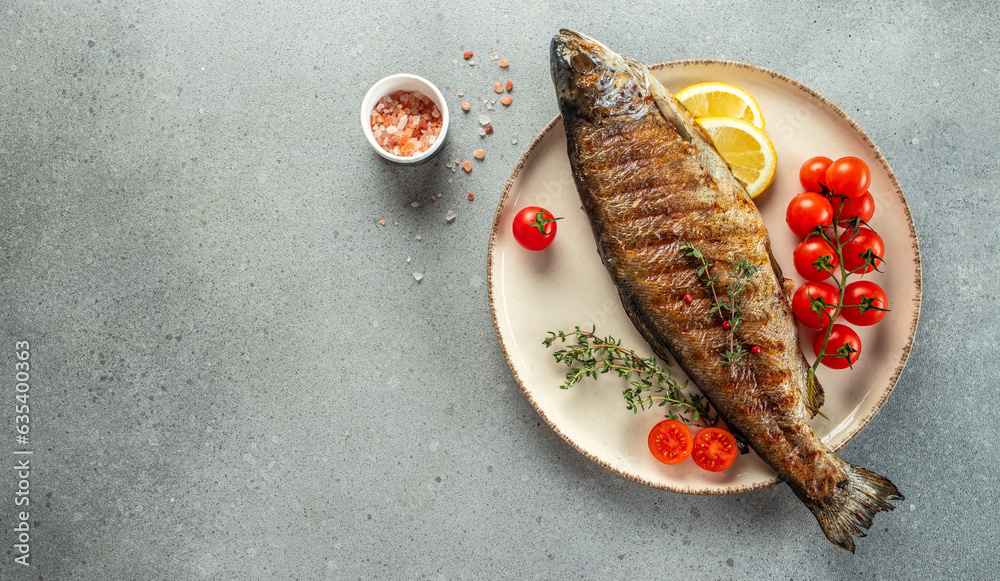 Grilled whole trout, Long banner format. top view