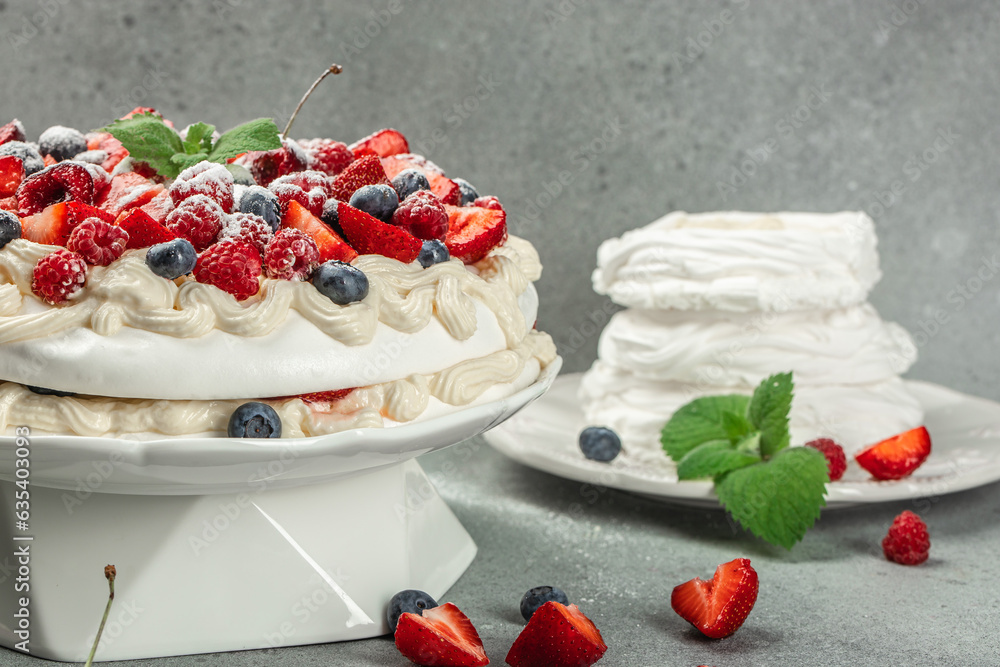Dessert meringue with berries, cake Pavlova, catering banner, menu, recipe