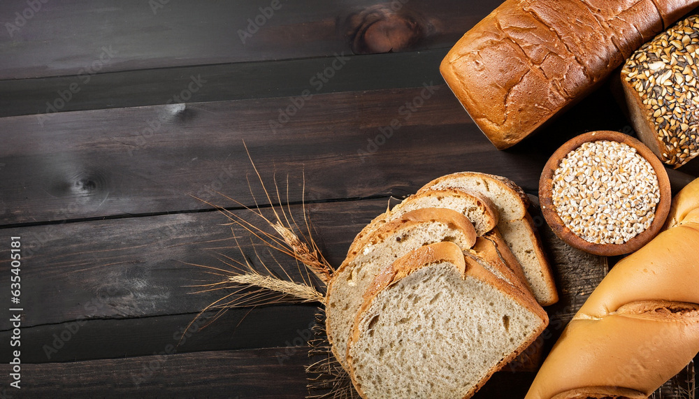 bread loaves and sliced bread with wheat seeds placed on a dark brown wooden table on a black background in a rustic kitchen or bakery There is a copy space - top view.