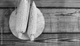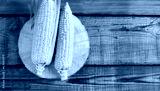 Fresh corn on the cob on a rustic wooden table with copy space - top view
