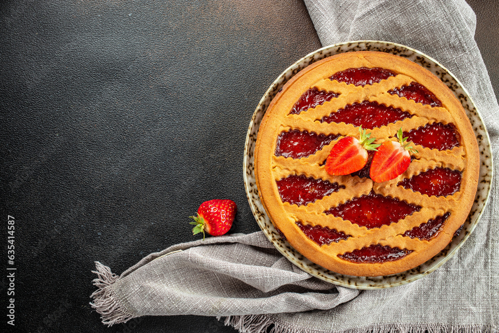 Traditional gourmet strawberry pie tart cake on a dark background, banner, menu, recipe place for text, top view