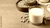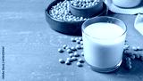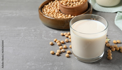Fresh soy milk and beans on light grey table, space for text