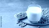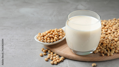 Fresh soy milk and beans on light grey table, space for text