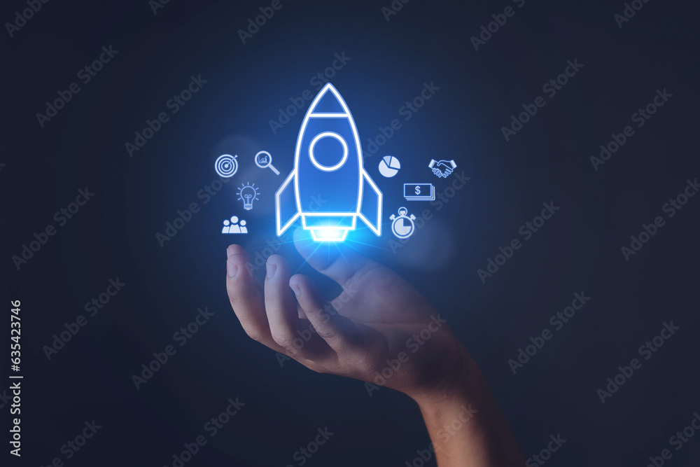 businessman showing Startup business concept Network connection icons on modern virtual interface rocket, idea, growth, digital, technology, concept, unicorn, company, future, success, global,